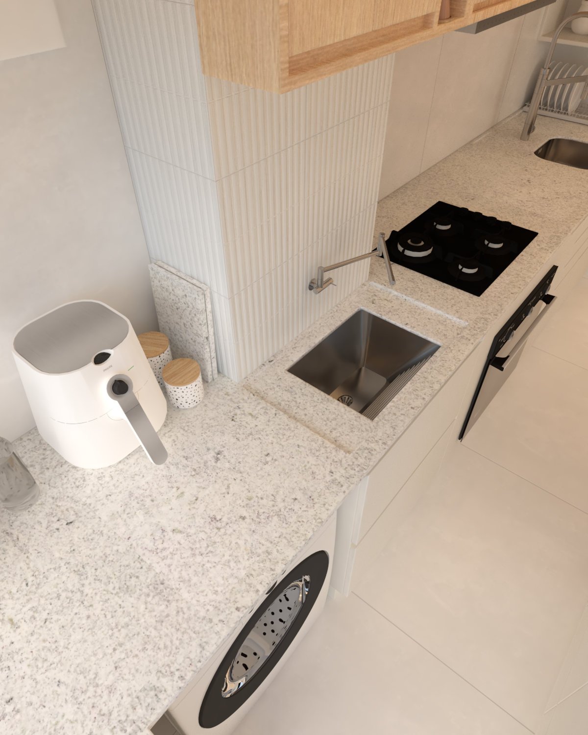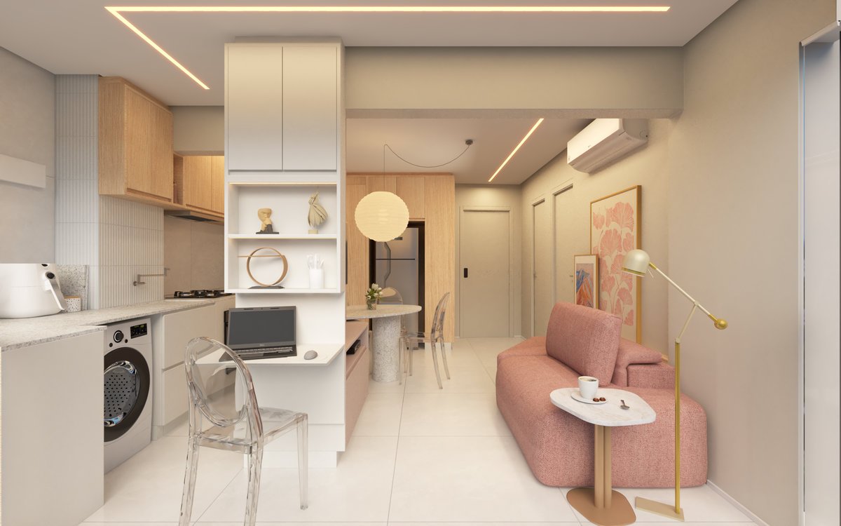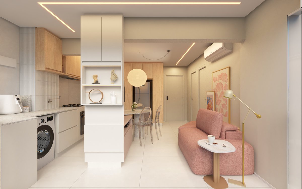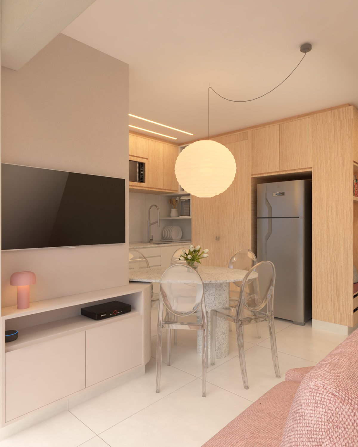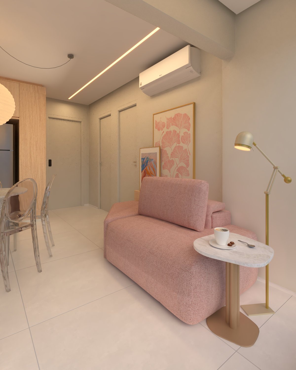 Com apenas um dormitório, este apartamento jovem traduz delicadeza e amplitude em cada detalhe. Tons claros e o toque suave do rosa criam atmosfera clean e elegante, com a mesa orgânica em pedra como coração do projeto, conectando todos os ambientes, integrados de forma fluida. Marcenaria contínua, banheiro elegante e quarto multifuncional com penteadeira e cabideiro fazem deste lar uma “casa de boneca” sofisticada e cheia de afeto.