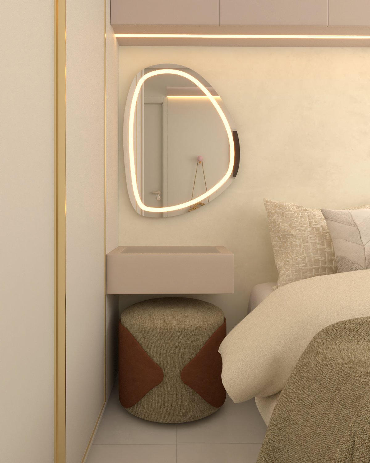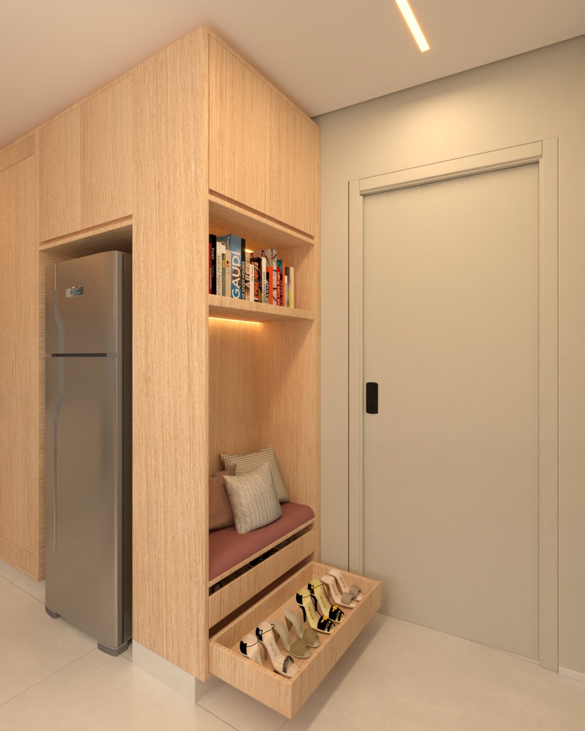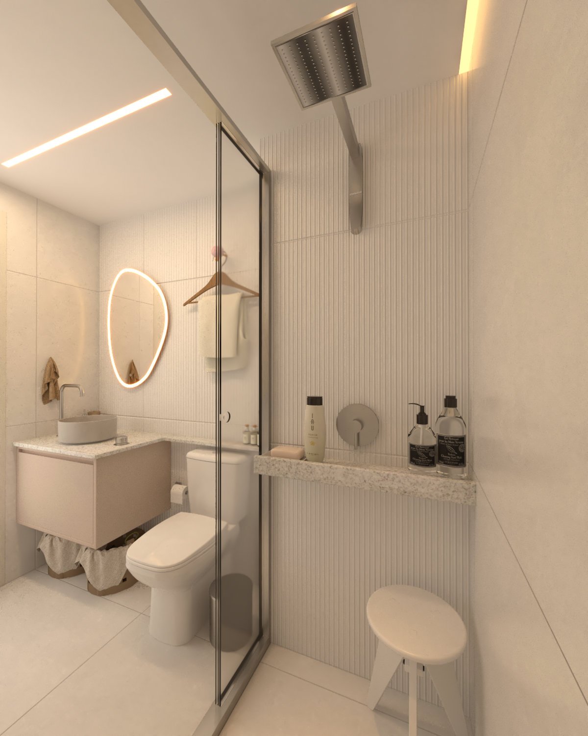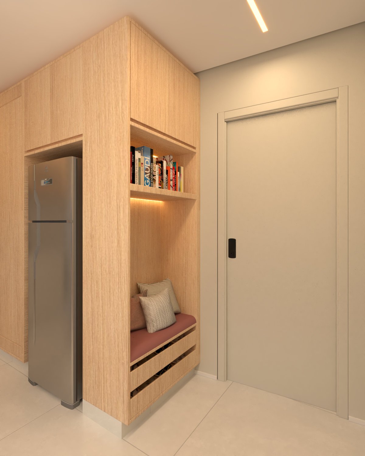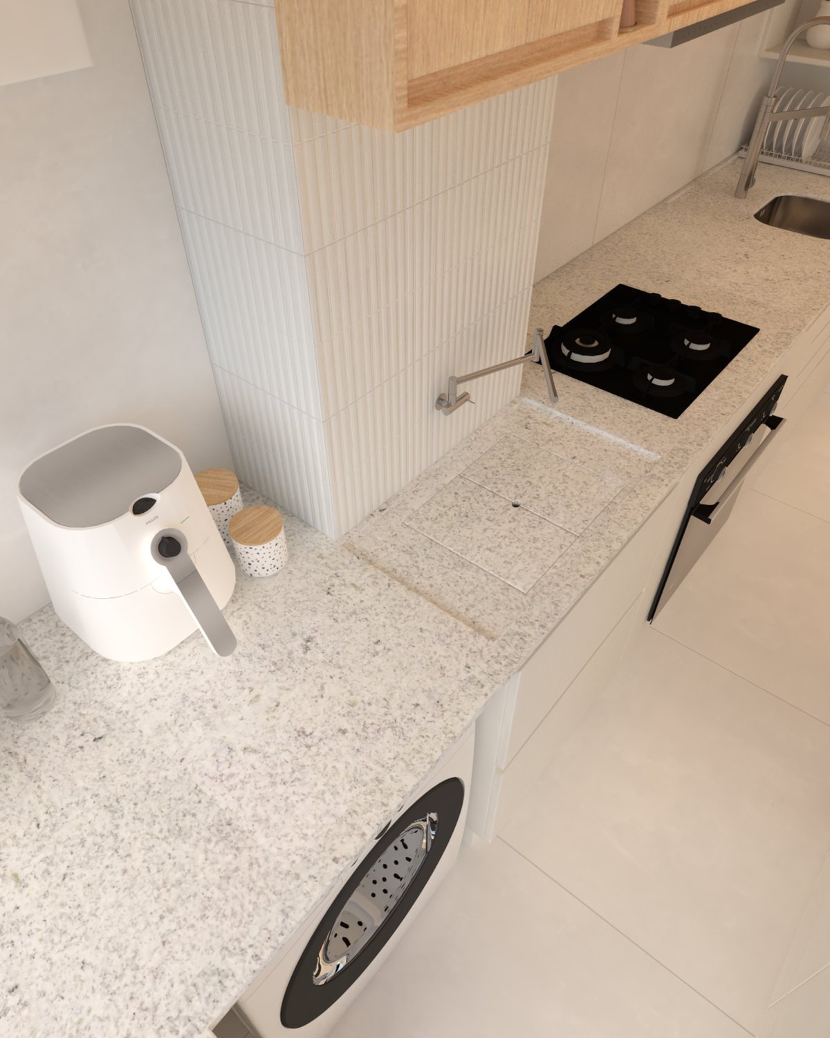 Com apenas um dormitório, este apartamento jovem traduz delicadeza e amplitude em cada detalhe. Tons claros e o toque suave do rosa criam atmosfera clean e elegante, com a mesa orgânica em pedra como coração do projeto, conectando todos os ambientes, integrados de forma fluida. Marcenaria contínua, banheiro elegante e quarto multifuncional com penteadeira e cabideiro fazem deste lar uma “casa de boneca” sofisticada e cheia de afeto.